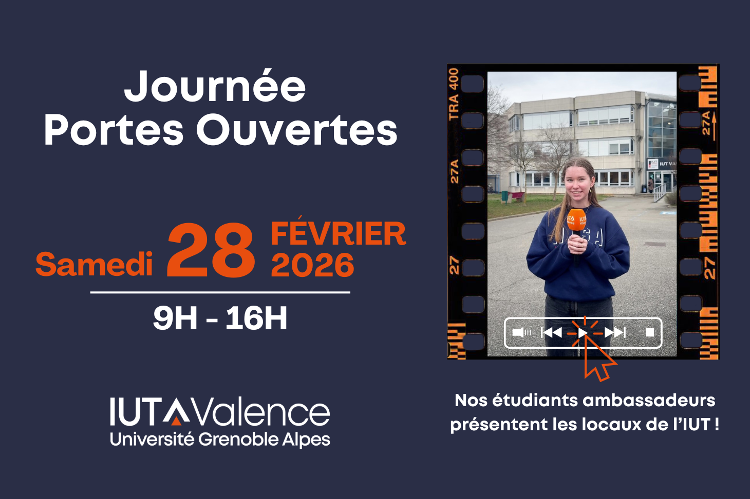 Enseignants, étudiants et personnels administratifs seront présents pour échanger avec vous sur les formations, la vie étudiante à Valence, les services proposés aux étudiants (transport, logement, bibliothèque, scolarité, club entreprises...)